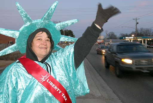 A woman dressed as the Statue of Liberty waving to evening rush hour traffic in front of Liberty Income Tax Service.