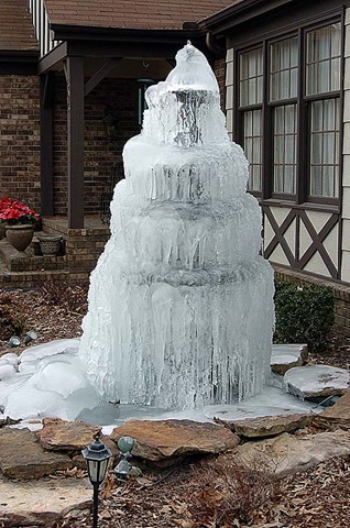 A photo of a frozen fountain. I almost blew this one off because my Indiana winter sensibilities told me this was no big deal. Where I come from, we freeze rivers and lakes. Well, in the Mid-South, it is a big deal. This photo is on page one in color this morning.