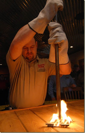 Today's front page is dominated by this photo of the training manager of the new Whiskey Creek restaurant and bar in nearby Paragould, Ark., using a red-hot branding iron to decorate the pine-topped bar. It's a custom with Whiskey Creek to have area cattlemen bring in their branding irons to brand the bar. And, of course, Whiskey Creek has its own brand. This is the 15th Whiskey Creek establishment and will open on Monday.