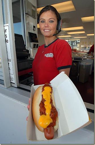 I'll lead off with what I think is the most eye-arresting photo of the day - a shot of Samantha Aitken offering up the first Nathan's Famous Hot Dog to be prepared at the Bruster's Real Ice Cream store on Jonesboro's southwestside.