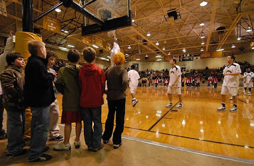 And then there's this one. A bunch of young boys hanging out under the goal at the pre-game shootaround, waiting for a stray ball to toss back and openly admiring their high school sports heroes. Do they realize it will be them out there on that hardwood floor in a few short years?