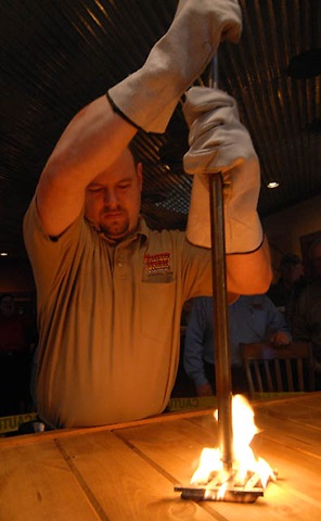 Today's front page is dominated by this photo of the training manager of the new Whiskey Creek restaurant and bar in nearby Paragould, Ark., using a red-hot branding iron to decorate the pine-topped bar. It's a custom with Whiskey Creek to have area cattlemen bring in their branding irons to brand the bar. And, of course, Whiskey Creek has its own brand. This is the 15th Whiskey Creek establishment and will open on Monday.
